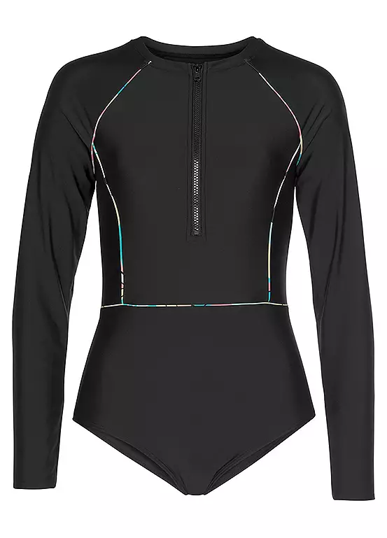 Attention water sports enthusiasts, with this swimsuit, you are well equipped for new personal bests! The lined surf suit is made of quick-drying, elastic material and with its long sleeves is also suitable for cooler temperatures. In addition to the zipper at the front which allows you to put it on and take it off. Finished with cool contrasting details. Contrast details. Long sleeve. Ideal for water sports. With recycled polyamide.