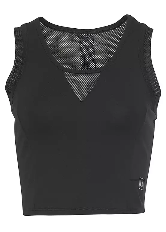 Sports top with contrasting branding and a racerback that sits perfectly and gives you full support during workouts. Equipped with airy mesh inserts in the chest area, on the straps and at the back.