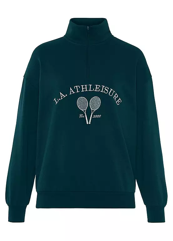 Casual sweatshirt by Lascana Active. Stand-up collar with zip. Large embroidery in front. ribbed cuffs. Dropped shoulders. For leisure and sports. Fine, soft sweat fabric. Embroidery on the front. Stand-up collar & zipper. Logo on the chest. Machine washable. Outer: 60% Cotton, 40% Polyester.