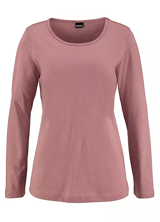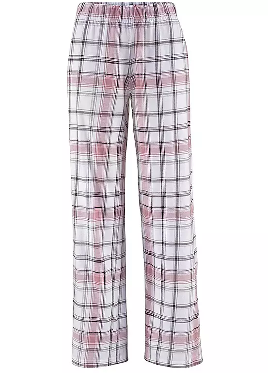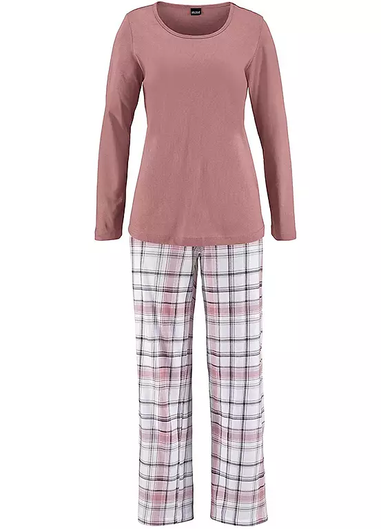 Single jersey cotton pyjamas by Arizona comprising a mauve top with long sleeves and a crew neck and checked bottoms with a straight leg.