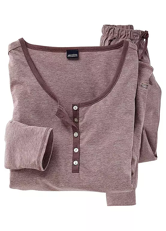 This classically comfortable pyjama set is blessed with a round neckline and mother of pearl buttons for extra feminine detail. They feature colour contrast detailing and decorative stitching and the long trousers come with an elasticated drawstring waist and side pockets.