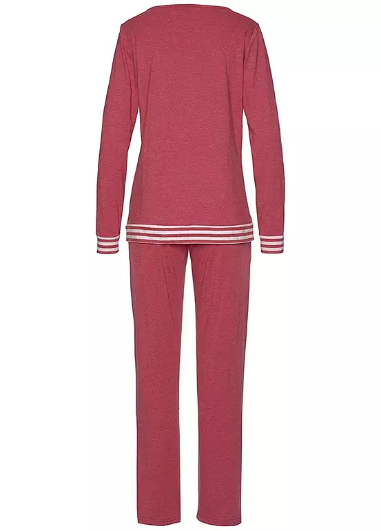 Long sleeve pyjamas crafted from a soft cotton blend in marl effect colours with stripe details. The rounded neckline top reveals trendy striped cuffs and hem. The matching long bottoms come with side pockets and striped tunnel drawstring.