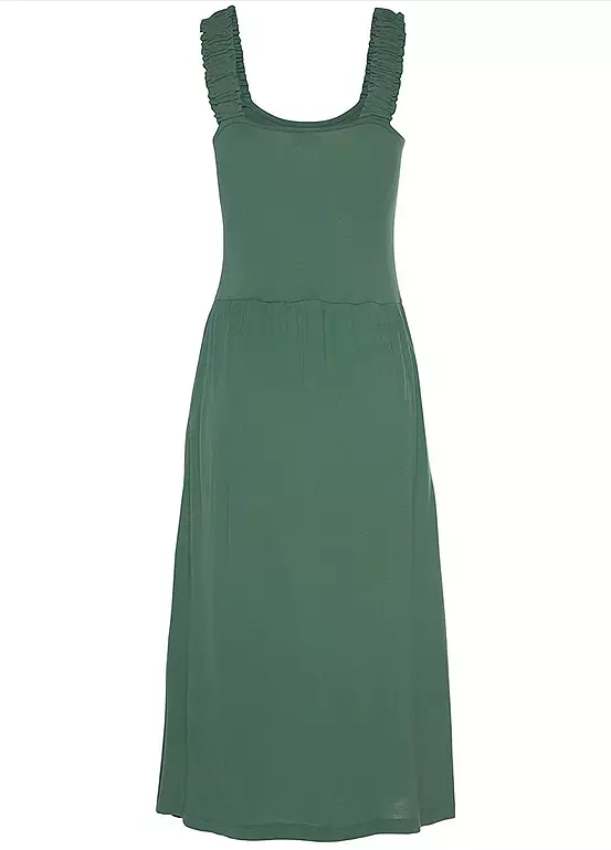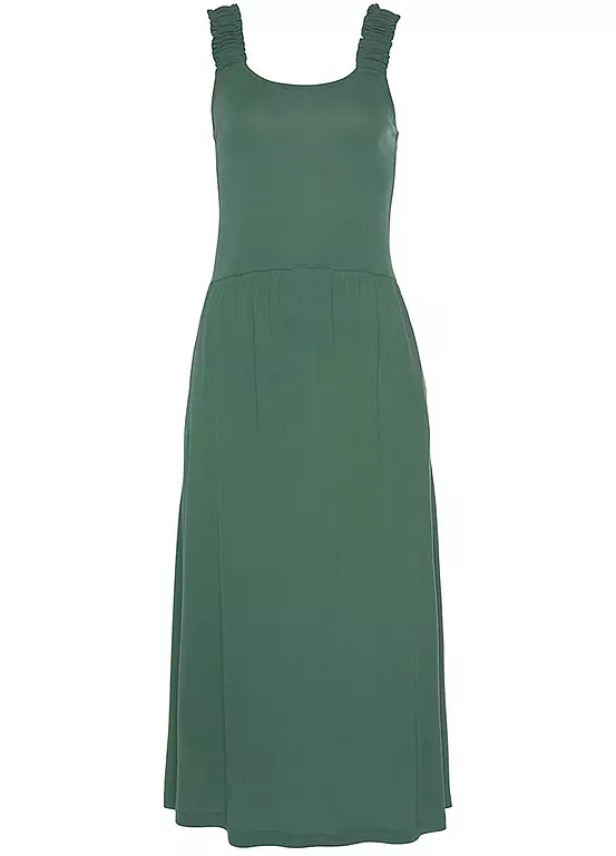 Beach Time dress. Wide, smocked straps. Décolleté with a round neckline. Integrated side seam pockets. Knee-length. Soft flowing viscose jersey. Round neckline. Wide, elastic smocked straps. Side seam pockets. 100% Viscose.