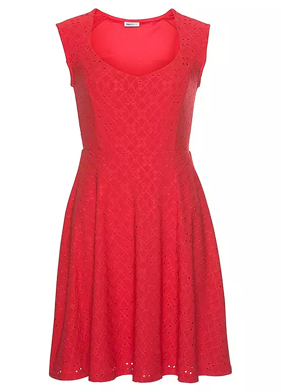 Summer dress with striking hole embroidery and a beautiful round neckline with a flared skirt. Featuring a rubber band at the waist and decorative seams that run from the waist over the chest. The stretch jersey fabric which follows every movement, ensures absolute comfort. With a fine cardigan, the beach dress will get you ready on countless occasions.