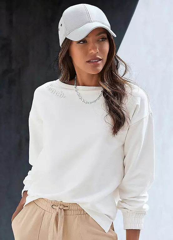 Check out the fashionable sweatshirt with a tone-on-tone logo print and comfortably wide round neckline with gathered cuffs. Very easy to combine a leisure look.