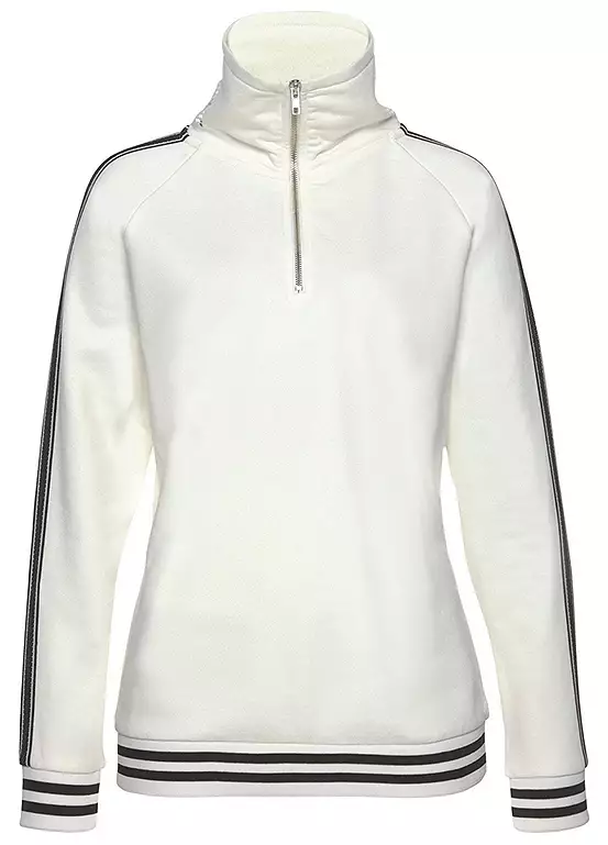 Sporty sweatshirt with a stand-up collar, along with a logo print on the back, zip fastener, tape stripes on the sleeves and striped trim. Softly textured on the inside for a more comfortable wear.
