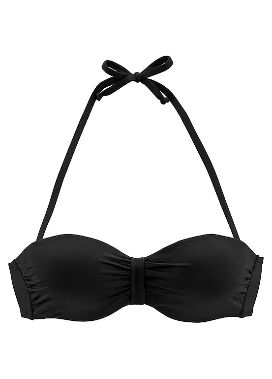 Fine folds and ruffles at the neckline determine the curvy shapes of the soft bustier. In addition, you can wear the bikini top with or without halter straps. The underwired cups give you good support in both versions and the soft microfibre material lies gently on your skin. Padded cups. Detachable straps. Mix the Mix-Kini as you wish. Cup B. Hand wash. 84% Polyamide, 16% Elastane. Lining: 100% Polyester.