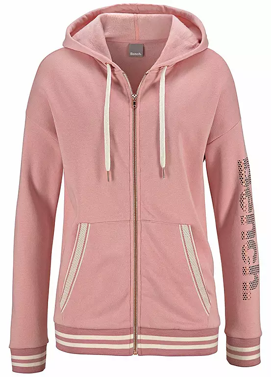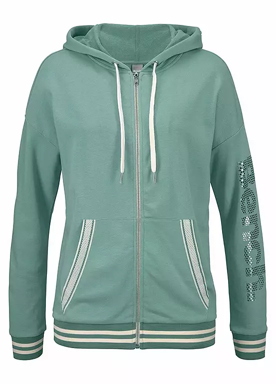 This fashionable zip-up hoody is a versatile basic. It features a hood with colour contrast drawstring, along with a logo print with shimmering effect on one sleeve, as well as a striped trim on the sleeve cuffs and hem. Mint and Apricot: 70% Cotton, 19% Modal, 11% Polyester. Grey Marl: 52% Cotton, 48% Polyester.