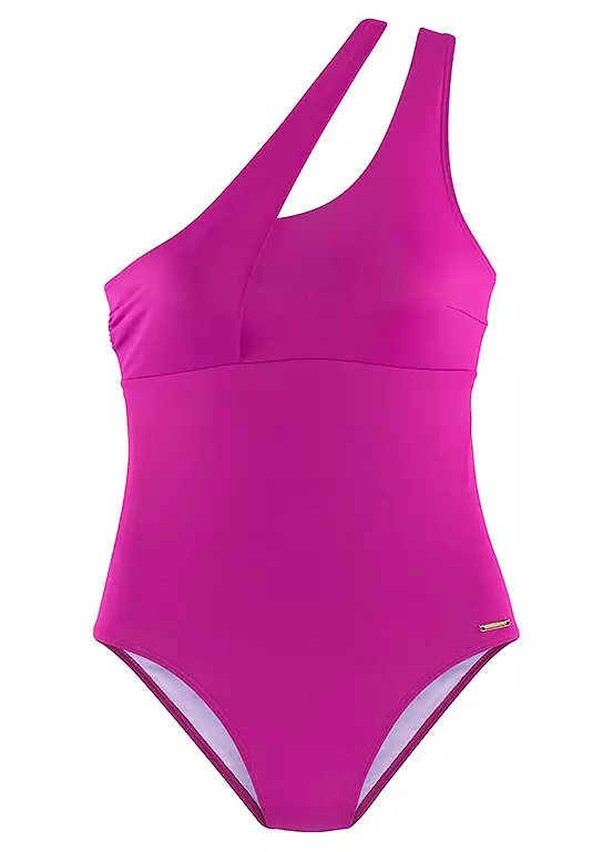 Check out the trendy one-shoulder swimsuit with removable soft cups and adjustable straps for individual comfort. Adjustable straps. Removable soft cups.