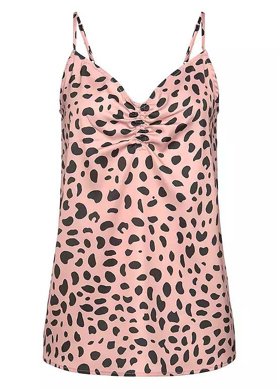 A stylish cami top with spaghetti straps and an all-over print. Equipped with adjustable spaghetti straps, a v-neckline with subtle ruffles and a straight fit. Finished in an elegant, shiny satin fabric.
