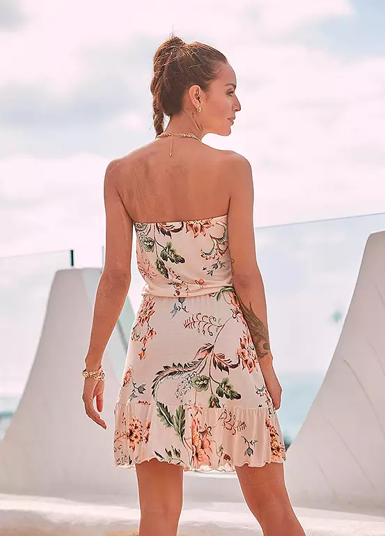 Check out this printed bandeau dress, featuring an off-the-shoulder top with a decorative button placket and elastic at the hips with a decorative cord. The skirt has a hem with flounce for added style. Made from soft viscose jersey. Elasticated waist with decorative cord. Floral print. Machine washable. 100% Viscose.