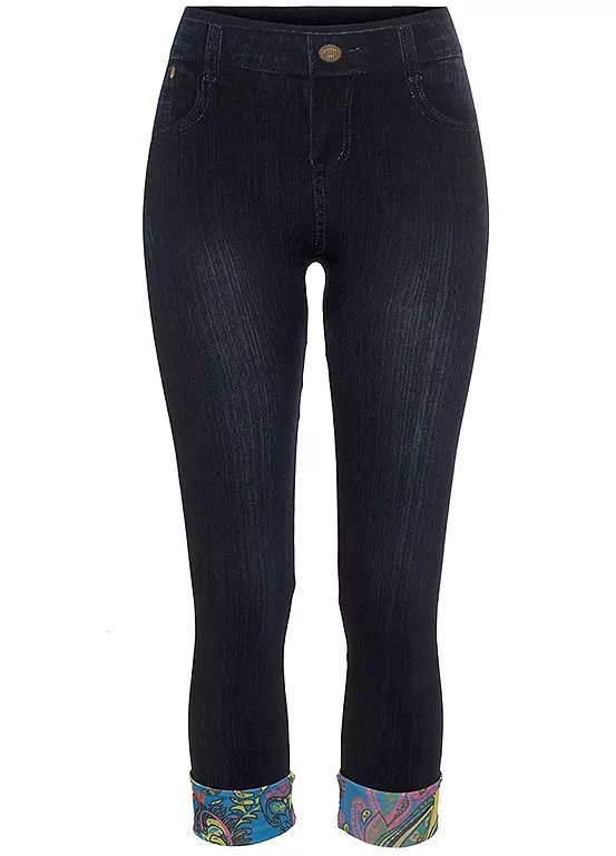 A fashionable pair of jeggings in a denim look. Highly elasticated with a printed waistband, along with front pockets and applied back pockets, as well as being in a skinny fit with a stylish roll-up hem.