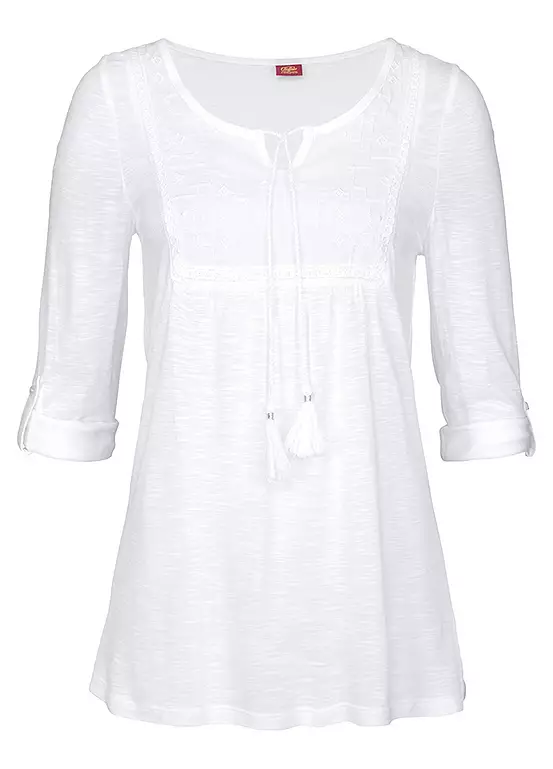 Enhance your holiday wardrobe! This stylish beach cover-up is great for a uncomplicated and cool look. Features a rounded neckline with tie straps and small tassels, along with tone on tone embroidery across the chest, as well as having on-trend cropped sleeves that can be rolled up and fastened with a tab. Length approx. 64 cm (25¼ in)