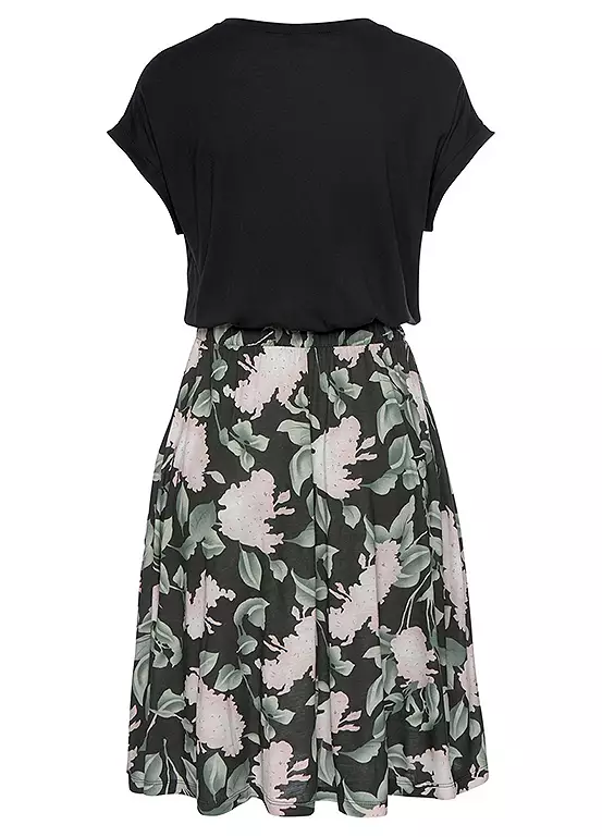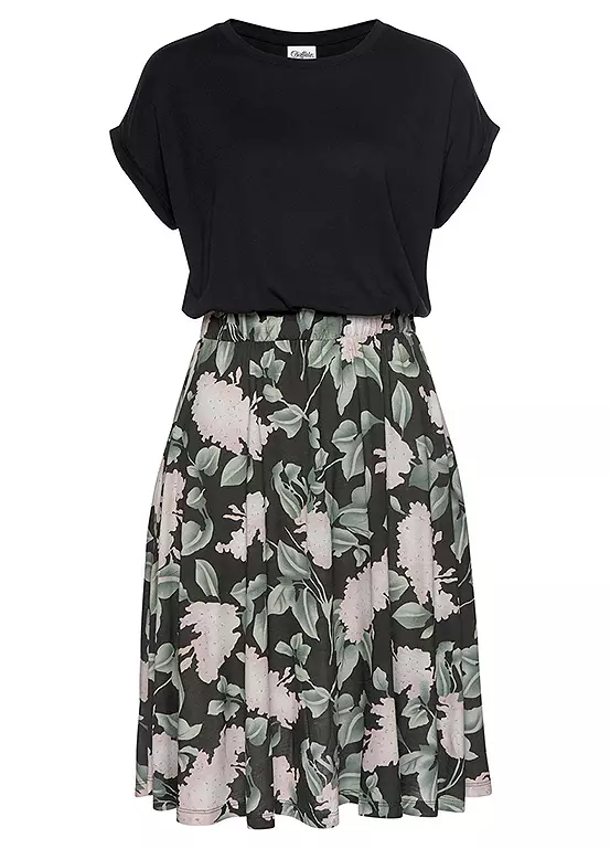 This beach dress is in a sophisticated 2-in-1 look. A simple plain-coloured top with short sleeves and a round neckline is combined with a printed skirt in a flower print. The wonderful comfort is supported by the soft viscose quality. Skirt length approx. 56 cm (22 in)