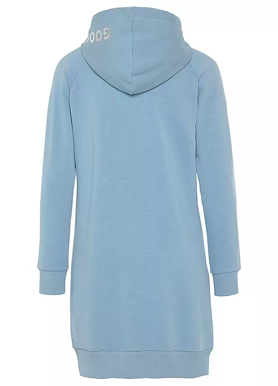 Fashionable hooded sweatshirt dress by Buffalo. Features a nice foil print along the hood and has long raglan sleeves, kangaroo pocket and ribbed cuffs on the hem. Made from a soft cotton material mix that feels great against the skin. Hooded sweat dress with foil print. Good Vibes slogan on the hood.