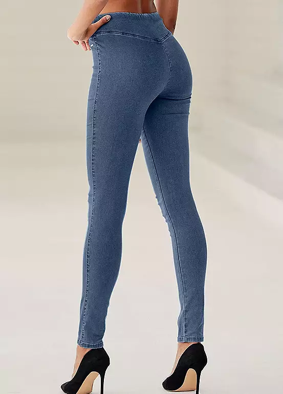 Classic jeggings by Buffalo. They feature a wide, elasticated waistband with v-shaped seam, as well as a small metal emblem on the side. Made from a soft material mix with stretch content for the perfect fit.