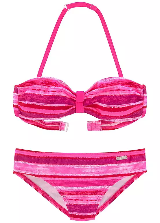 This trendy bandeau bikini by Buffalo is in a summery stripe print. Features straps which are adjustable at the neck, as well as side boning and adjustable closure at the back. The classic bikini bottoms have a small metal label on the waistband. Summer design. Straps adjustable at the neck. Adjustable closure at back.