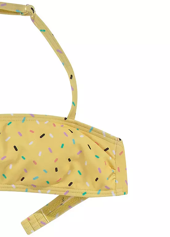 Fashionable kids bandeau bikini in a summery print. The two-piece set consists of a classically cut bikini bottom and a bandeau top with an adjustable halterneck strap and side boning for support. Summery print. Adjustable halter strap.