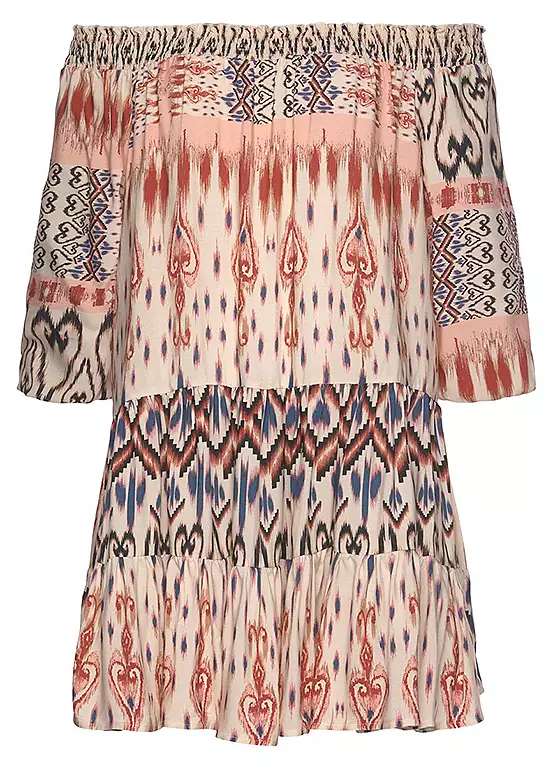 This enchanting printed dress is wonderfully airy and stylish. Designed with a flared fit and a charming Carmen neckline, which is reminiscent of a summer tunic at first glance. A wide stretch band is incorporated into the neckline, providing support, while the flounces on the waist provides the style. Finished with cropped-length sleeves.
