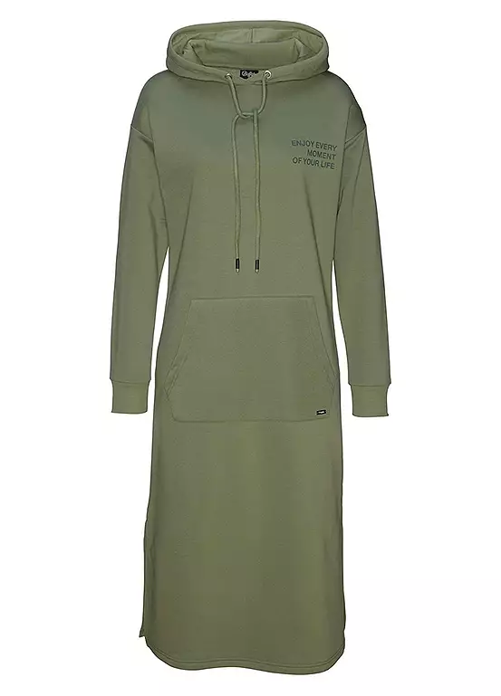 Comfortable hooded sweat dress in a midi length with lettering on the chest. Styled with dropped shoulders, ribbed cuffs, a kangaroo pocket with a small emblem and side hem slits. Soft French terry quality made from a cotton blend.