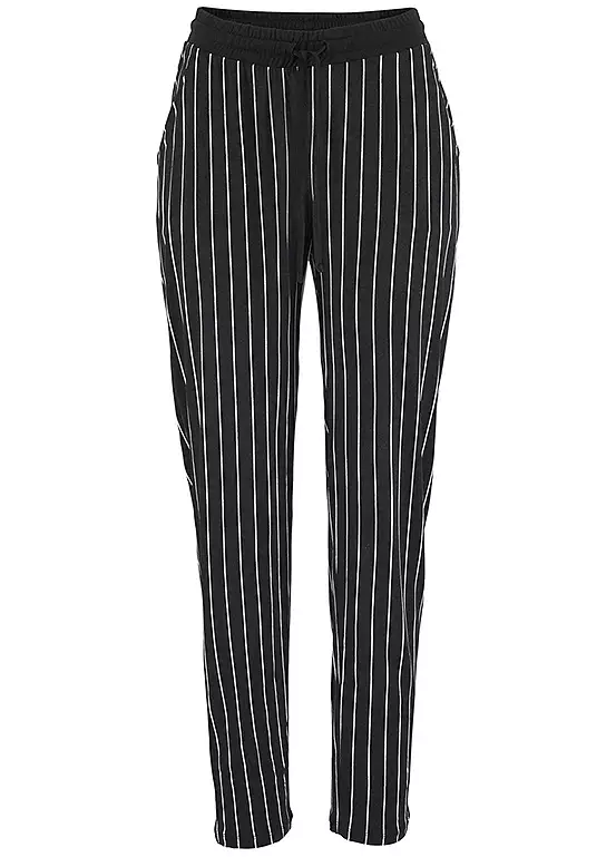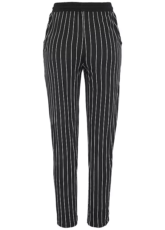 Be on-trend this summer with these striking black and white stripe beach trousers. Crafted from a light flowing fabric, featuring an elasticated waistband with decorative drawstring, complete with slit pockets at the side.