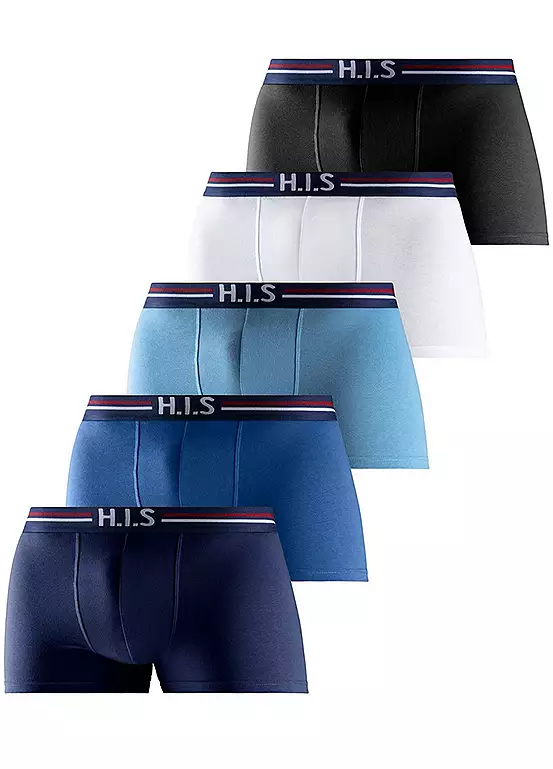 5 Pack slim boxers by HIS Regular fit. Soft waistband with branding at front. Made from stretchy cotton for smooth comfort. Pack of 5. Regular fit. Soft waistband. Colour 1: Navy, Colour 2: Blue, Colour 3: Light blue, Colour 4: Black, Colour 5: White.