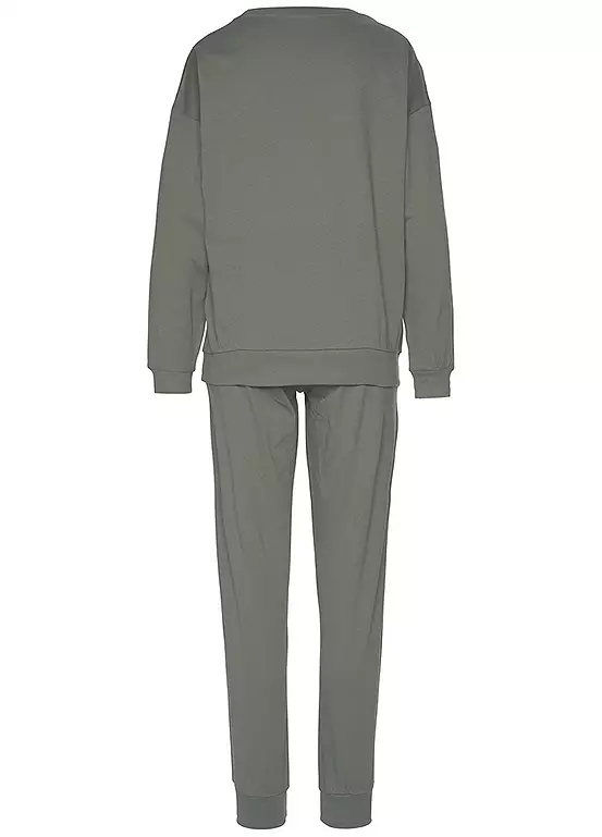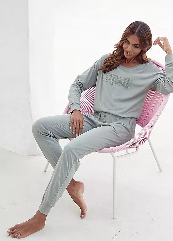 Comfortable pyjamas in soft single jersey fabric featuring a long sleeve top with a slogan print on the front, a round neckline and raglan sleeves. The relaxed look is complete with long pyjama bottoms with an elasticated drawstring waistband and cuffs at the ankles. Side pockets. Slogan front print. Ribbed cuffs at the hems.