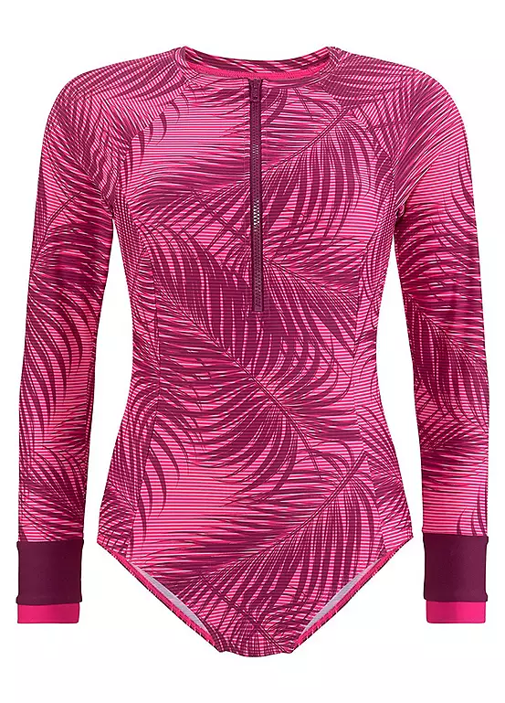 A trendy swimsuit in a fashionable palm tree print with contrasting cuffs on the long sleeves. Perfect for your favourite sport even when the water and air temperatures are cooler. The zipper on the front adds practical detail while the soft, stretchy material ensures comfort in and on the water. Trendy palm print. Front with zip.