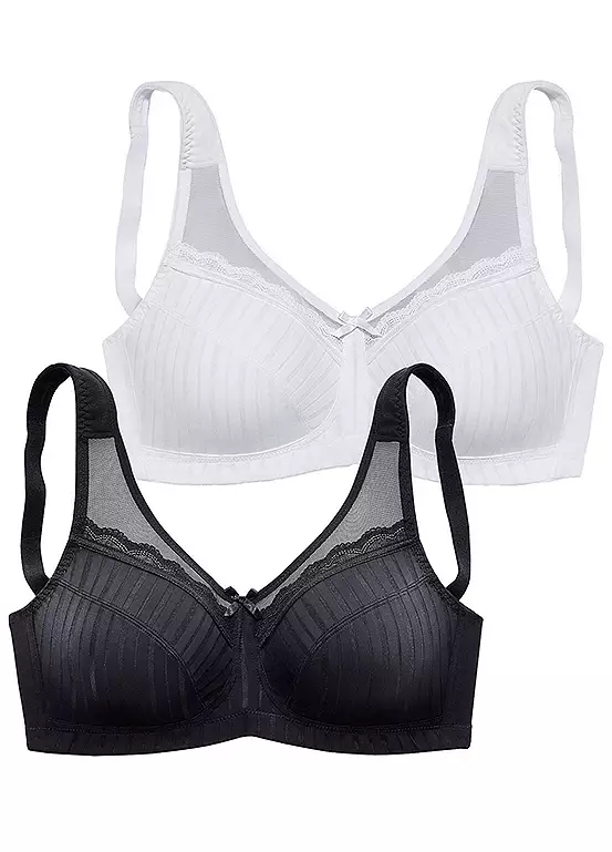 Classic support bras made from floral lace and fine soft mesh in a double pack. Wide lined straps relieve the shoulders for maximum comfort. Created with love and passion in Hamburg. Pack of 2. Wide lined straps. Individually adjustable straps & back fastening. Hand wash. 45% Polyamide, 40% Cotton, 15% Elastane.