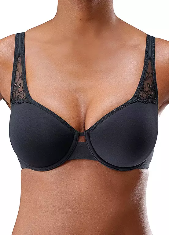 Comfortable underwired bra made from soft cotton. Its simple seamless pre-formed cups lie comfortably flat without protruding, even under tight t-shirts. The bottom of the straps features plain coloured embroidery that creates a feminine look plus the cups are lined at the side to provide comfortable support even in large sizes. Available in an economical double pack containing basic black and white colours. The straps and rear fastening are adjustable.