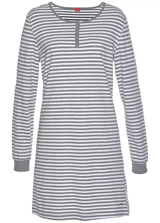 Take a stylish trip to dreamland in this beautiful patterned night dress. It has everything you need to wrap yourself up in an attractive look for the night. It’s in an all-over stripe design, with a crew neck with a short button placket, as well as slightly overcut shoulders and contrast sleeve cuffs. Made from an elasticated cotton material mix.