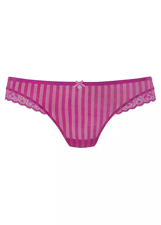 A pretty thong that combines soft, striped mesh fabric with feminine lace. Decorated with a small decorative bow and a metal label on the front and finished with a comfortable cotton gusset. Elastic mesh fabric with a striped look.
