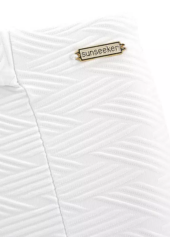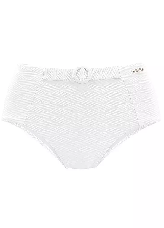 Check out the structured bikini bottoms in a higher cut and finished with a buckled belt detail. With a decorative belt. Cut higher.