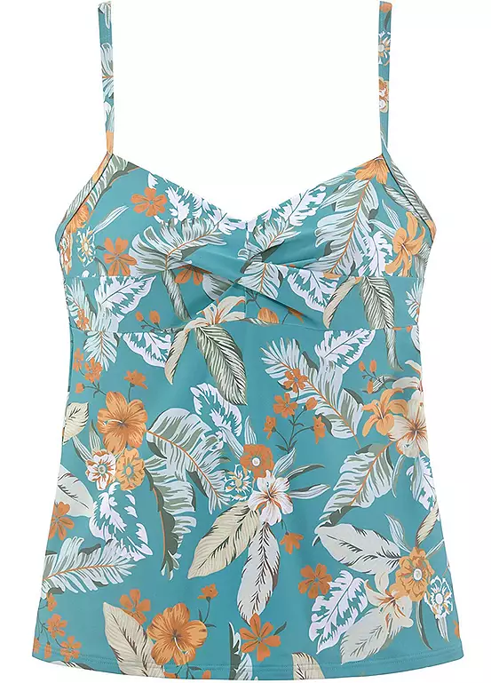 Fashionable underwired tankini top in a summery print. The tankini provides good support thanks to underbust rubber. Designed with adjustable straps and gathering in the chest area. Perfect for mixing and matching. Trendy tropical print. Underbust rubber all around. Soft microfiber.