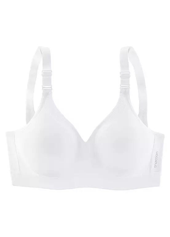 This non-wired sports bra has seamlessly pre-formed cups for extremely good support during your workout. It’s made with a stretch functional material, along with soft extra-wide and adjustable straps, which can also be worn crosswise! Stylish mesh material in a net look runs along the edge of the cup and gives the bra its sporty look.