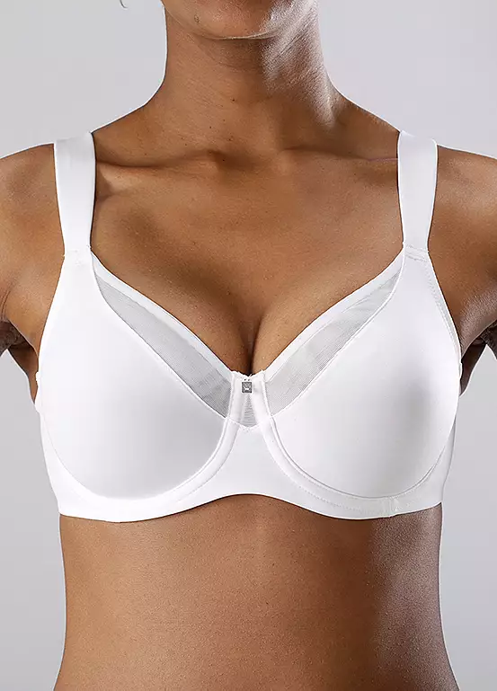 A classic, functional minimiser bra featuring soft, flat straps that relieve the shoulders, and with comfortable underwire for an optimum fit. It also comes with a decorative net insert above the cups, plus adjustable straps and back closure.