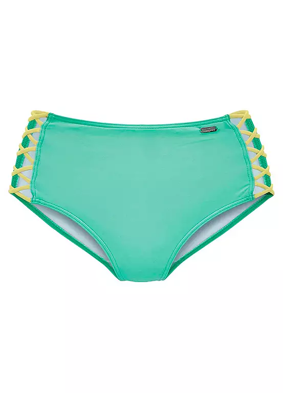 The 60s are back and the high-waisted bikini bottoms are a celebration. The bottoms not only impress with their cool contrasting design but above all with their high cut. This not only emphasizes your great waist in a completely new way, but also flatters your figure. Whether with a bandeau top or triangle top – there are absolutely no limits to your mix-kini passion with the great high-waist bikini bottoms. Crossed ties on the sides. Extra high cut shape.