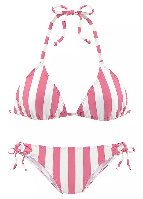A maritime-style triangle bikini set by Venice Beach in a stripe design. The top features removable soft cups and ties at the neck and to close at the back. The matching briefs come with side ties. Removable soft cups. To close in the back. Briefs to tie at the side. Removable soft cups. To close in the back.