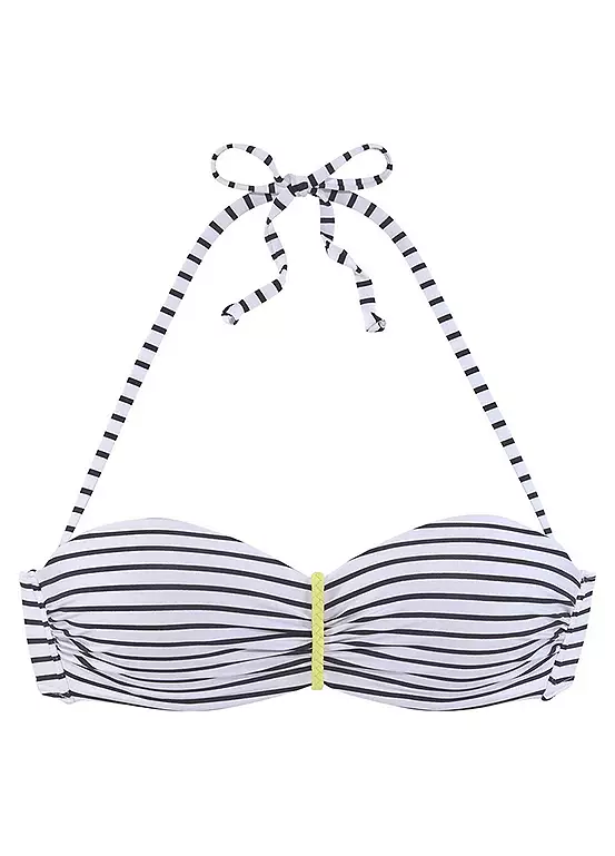 In a striped design and braided contrast detail, the padded cups on this bikini top conjure up a great décolleté, and the boning on the side provides the necessary support. You can remove the straps if necessary or tie them in the neck. A perfect mix and match piece. Braided contrast details. Removable cups for cup A and B. Side boning.