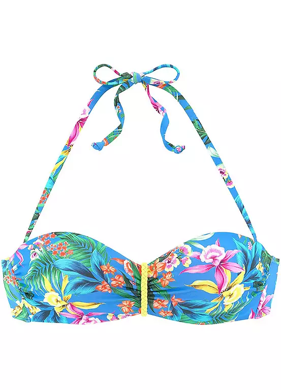 Patterned underwired bandeau top in a tropical print with padded cups and detachable straps. Printed – each piece is unique. Padded cups. Soft microfibre with recycled polyamide.