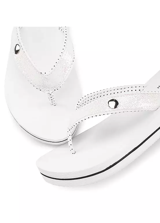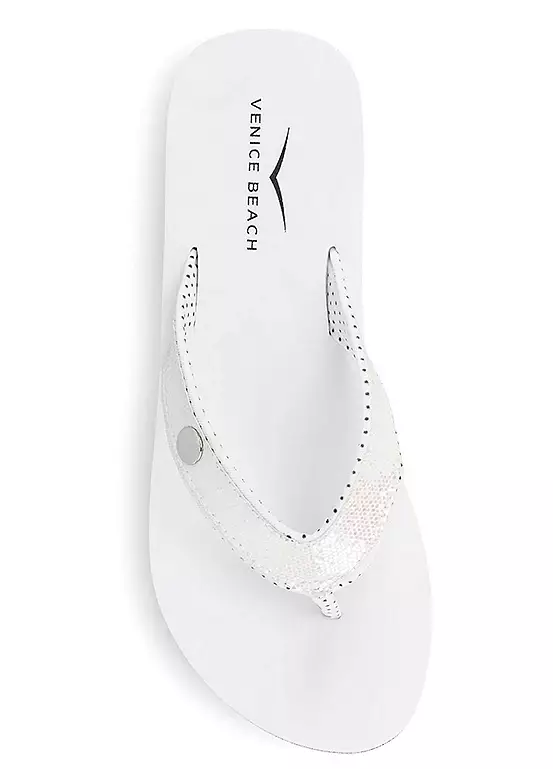 Pretty flip flops in a classic shape with a slight heel and a relaxed style. Finished in a trendy glitter effect with fine embossing, a slightly profiled sole and water-repellent material. Water-repellent material. Decorated with subtle glitter. Peta approved vegan – free of animal components. Heel height approx. 3 cm.
