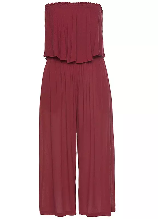 Elegant bandeau overalls by Vivance with a smocked top with fashionable flounces. Side pockets. Wide trousers with a 7/8 length. Made of soft viscose quality. Smocked top. Wide trousers with a 7/8 length. Off-the-shoulder. Machine washable. 100% Viscose.
