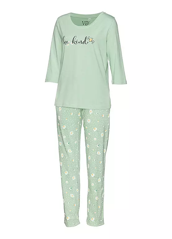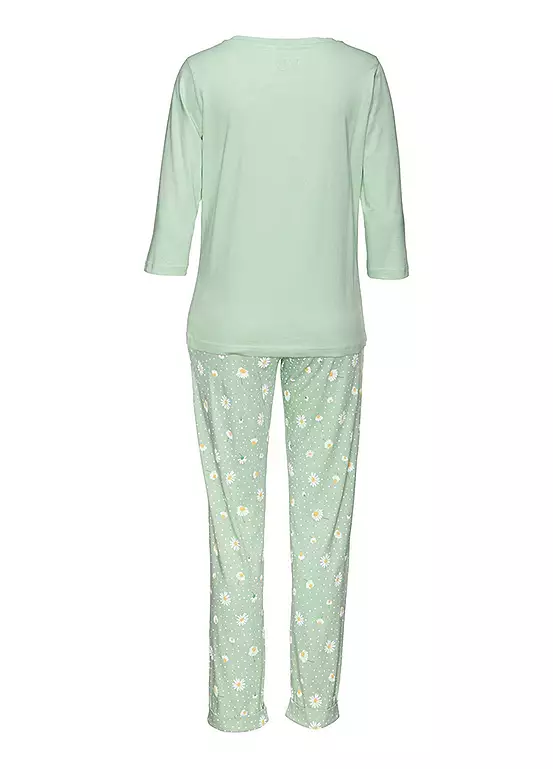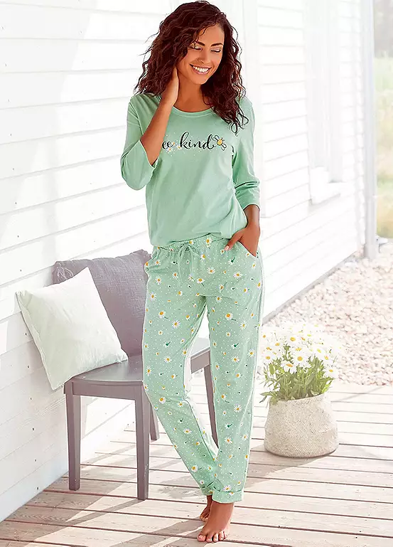 These comfortable pyjamas impress with their design and wearing comfort. The pyjama bottoms are designed with an all-over print that is particularly eye-catching and an elastic waistband to offer you the perfect fit. The top is in a monochrome design that contrasts the printed pyjama bottoms. Soft single jersey quality made from pure cotton.