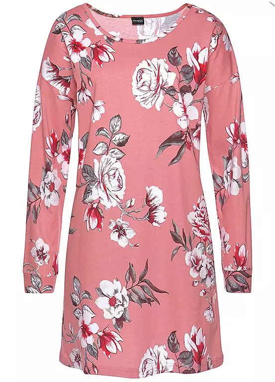 Short nightgown in an all-over floral print, made from soft single jersey quality cotton. Featuring a round neckline with long sleeves and dropped shoulders.