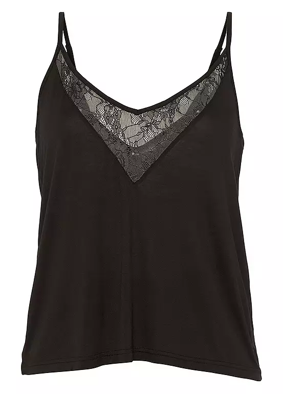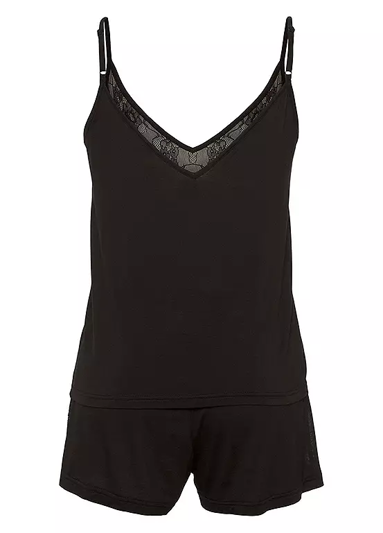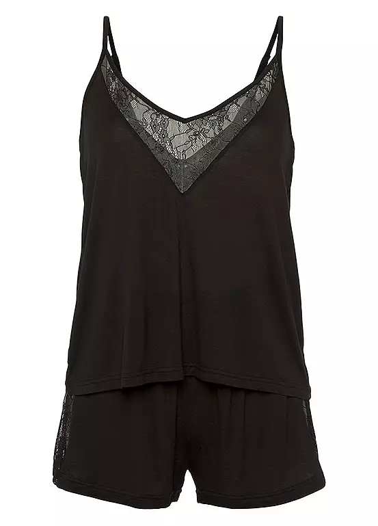 Get ready for a dreamy night’s sleep in this stylish set – shorty pyjamas with beautiful lace details. The cami top features a V-neck at the front and back, while the shorts feature an elasticated waistband and lace side inserts. Made from a soft viscose blend, these PJs are perfect for a comfy night in! Shorty pyjamas with beautiful lace details. Cami top with V-neck at the front and back. Made from viscose blend.