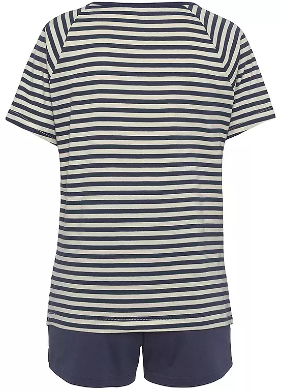 Shortie pyjamas by Vivance Dreams comprising a striped t-shirt with raglan sleeves, a round neckline and fine wording embroidery, plus matching shorts with an elasticated waistband and side pockets. Shortie pyjama set with embroidery. Striped t-shirt with a crew neck & raglan sleeves.
