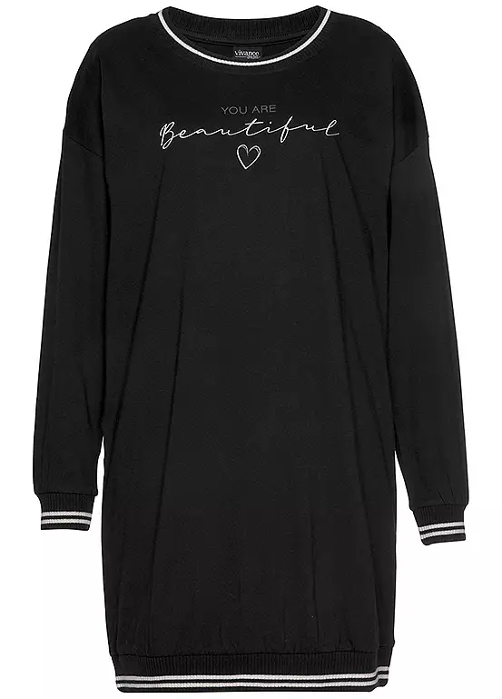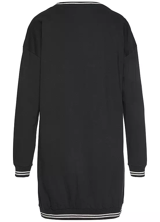 A comfortable nightgown with a large slogan print on the front and striped ribbed trims. Finished with a crew neckline, dropped shoulders and long sleeves. Striped ribbed hems. Dropped shoulders and long sleeves. Soft single jersey fabric.