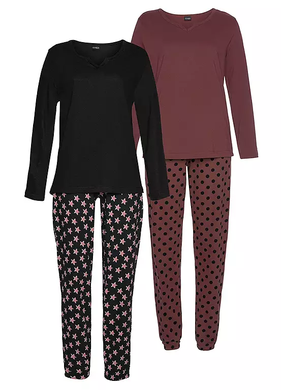 Comfortable pyjamas set in a pack of two, the long-sleeved top is in a plain design with a v-neckline. The narrow cut pyjamas are styled with a star print and elastic drawstring waistband.