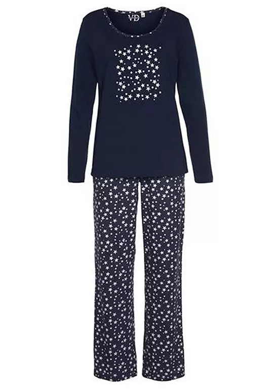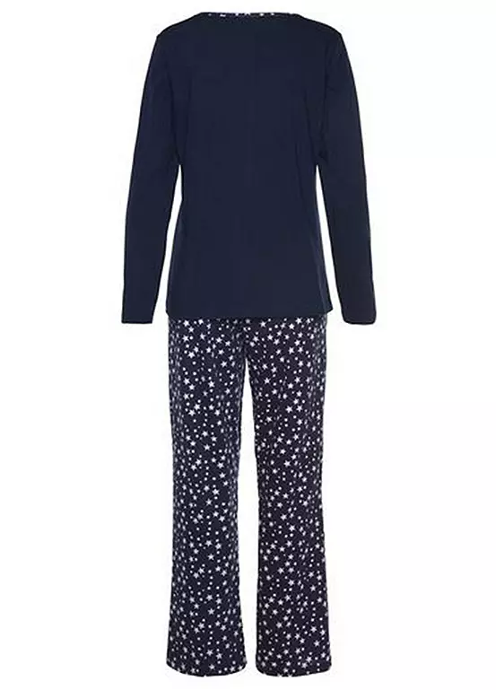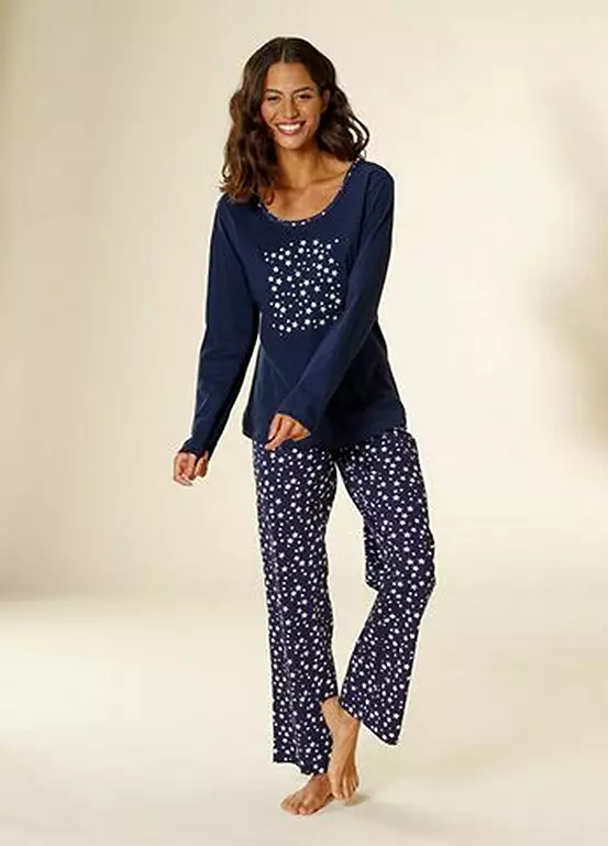 Star print pyjamas made from soft single jersey quality cotton. The long sleeve top features a front print while the matching bottoms come in an all-over print with an elasticated waistband.