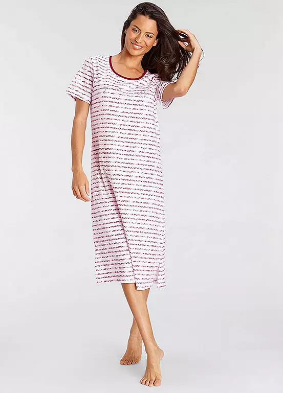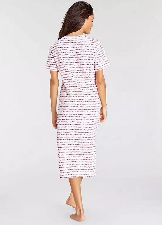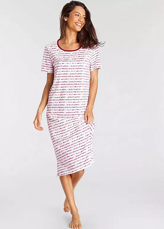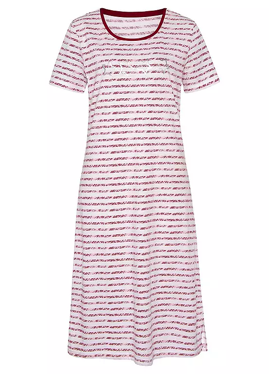 A midi length nightdress with stripe design and foil print at the front, it’s perfect for a night of sweet dreams! With short sleeves and a round neckline, it’ll keep you comfy and stylish all night. Side slits at the hem for extra flair and made of pure cotton to keep you cosy. Sweet dreams guaranteed! Midi length nightdress with stripe design and foil print at the front. With short sleeves and a round neckline. Soft single jersey made of cotton.